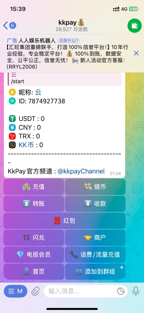 有飞机的可以点一下@kkpay 钱包置顶的人人娱乐广告点进去激活机器人,之后不用理会,会有专员私信问你要不要领取体验金,彩金限制电子5水,只能提彩金的5倍